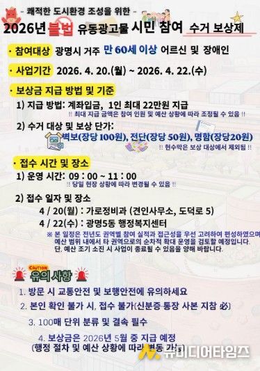 엄인봉 가로정비과장은 “불법광고물 수거보상제는 시민 자발적 참여로 행정력이 미치기 어려운 사각지대까지 세심하게 살필 수 있는 뜻깊은 사업”이라며 “시민 작은 실천이 모여 안전하고 쾌적한 도시 환경을 조성하는 밑거름이 되는 만큼 많은 관심과 동참을 바란다”고 밝혔다.