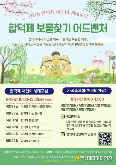 당진시는 오는 6월까지 합덕제 야외 현장 및 합덕수리민속박물관에서 2026합덕제 어린이 생태교실 및 보물찾기 어드벤처 프로그램을 운영한다고 7일 밝혔다.