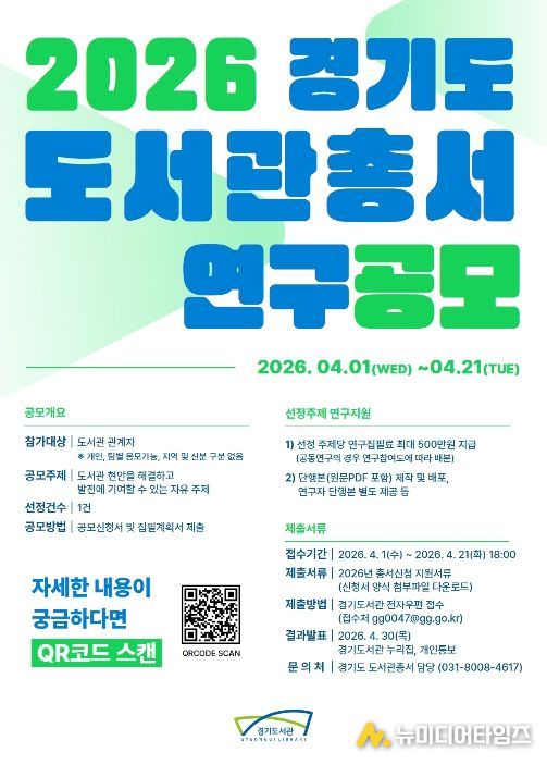 경기도는 도서관 현장의 문제 해결과 서비스 혁신을 위한 ‘2026 경기도 도서관총서 연구 공모’를 추진한다고 7일 밝혔다.
