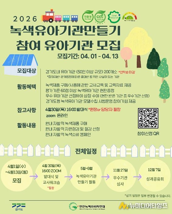 경기도가 아이들이 생활 속에서 올바른 녹색 소비 습관을 가질 수 있도록 돕는 ‘2026년 녹색유아기관만들기’ 참여 기관 200곳을 4월 13일까지 모집한다.
