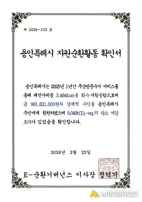 용인특례시는 2025년 폐전자제품 무상방문수거 실적에서 경기도 내 1위를 달성했다고 7일 밝혔다.
