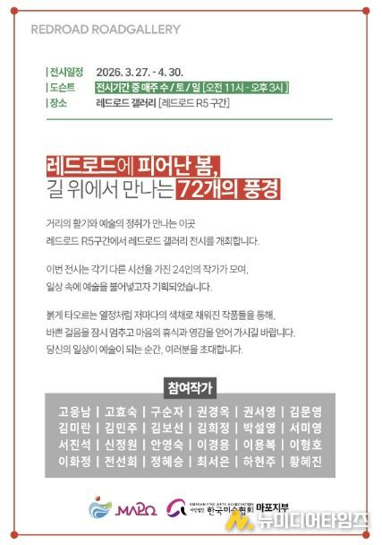 이번 전시는 ‘레드로드에 피어난 봄, 길 위에서 만나는 72개의 풍경’을 주제로 총 24명의 작가가 참여해 회화와 일러스트 등 다양한 작품 72점을 선보인다.