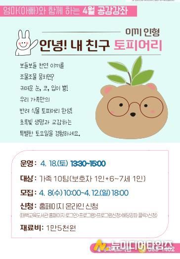 태백교육도서관은 4월 18일 오후 1시 30분 태백교육도서관 1층 다목적실에서 6~7세 자녀와 부모로 구성된 가족 10팀, 총 20명을 대상으로 4월 공감강좌 ‘안녕! 내 친구 토피어리’를 운영한다.