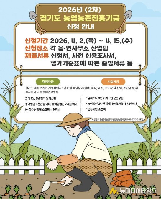양평군은 농어업인의 소득 향상과 삶의 질 개선, 경영 안정을 도모하고 농업 경쟁력 강화를 위해 ‘2026년 경기도 농업농촌진흥기금 경영 및 시설자금 지원’ 2차 대상자를 모집한다고 밝혔다.