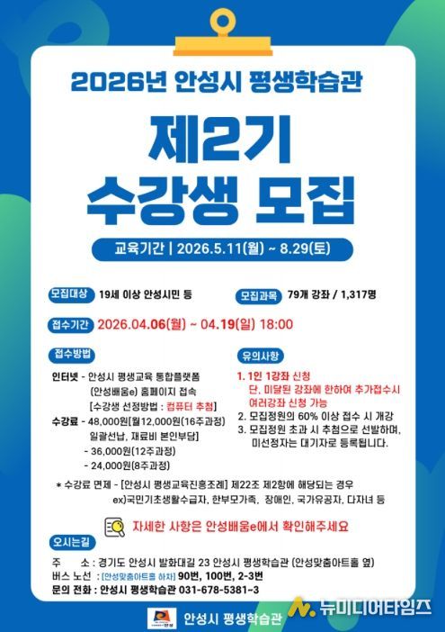 안성시 관계자는 “시민의 다양한 학습 수요를 반영해 프로그램을 확대하고 운영 방식을 개선했다”며 “앞으로도 누구나 쉽게 참여할 수 있는 평생학습 환경을 조성해 나가겠다”고 밝혔다.