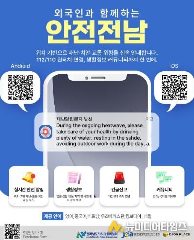 한편, ‘다국어 안전전남 앱’은 스마트폰 앱스토어에서 무료로 내려받을 수 있다.