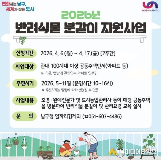부산 남구는 구민들의 반려식물 관리에 대한 이해를 돕고 관리 능력을 높이기 위해 ‘2026년 반려식물 분갈이 지원사업’에 참여할 공동주택을 모집한다고 밝혔다.