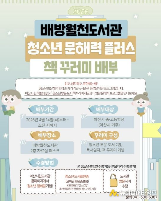 책 배부는 선착순 신청으로 아산시에 거주하는 중·고등학생을 대상으로 하며, 수령은 배방월천도서관 2층 자료실 데스크에서 청소년 본인에 한해 가능하다.