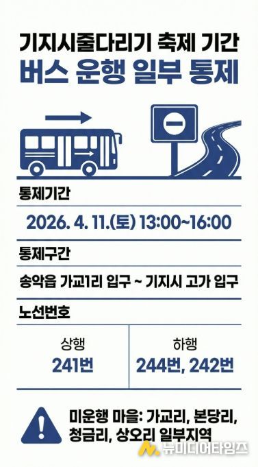 이번 통제는 4월 11일 오후 1시부터 4시까지 3시간 동안 송악읍 가교1리 입구~기지시 고가 입구 구간에서 실시한다. 해당 시간 동안 시내버스 상행 241번, 하행 244번, 242번 노선은 해당 구간을 우회 운행한다.