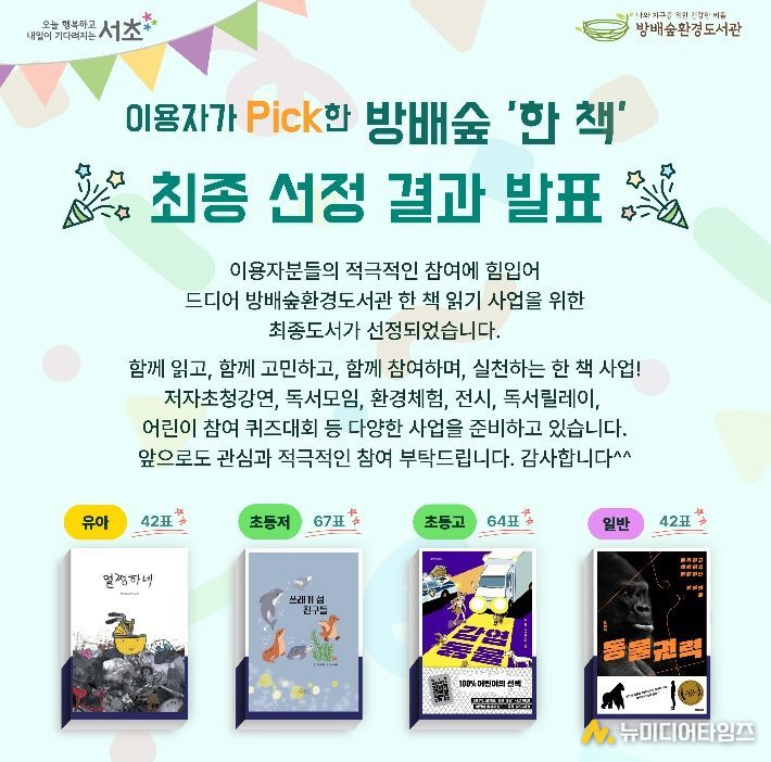 도서관은 먼저 환경부가 선정한 2025 우수환경도서 30권을 전문가와 독서동아리 회원들이 먼저 읽고 후보 도서를 심사한 뒤, 지난 2월 24일부터 3월 17일까지 일반 이용자들을 대상으로 온·오프라인 투표를 진행했다. 총 340명의 주민이 참여한 결과 ▲멀쩡하네(임서경 저) ▲쓰레기 섬 친구들(이미령 저) ▲감염동물(김시경 저) ▲동물권력(남종영 저) 등 4권이 올해의 방배숲 ‘한 책’으로 선정됐다.