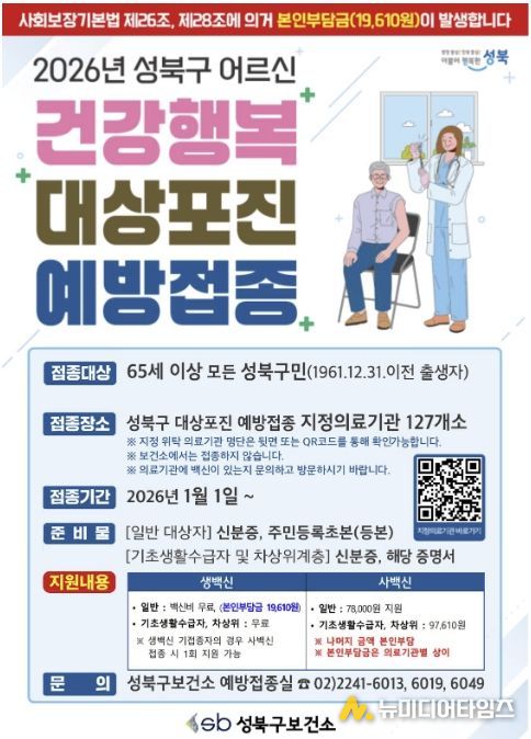 서울 성북구가 2026년 1월 1일부터 65세 이상 구민 전체를 대상으로 ‘어르신 건강행복 대상포진 예방접종 지원사업’을 추진하고 있다.