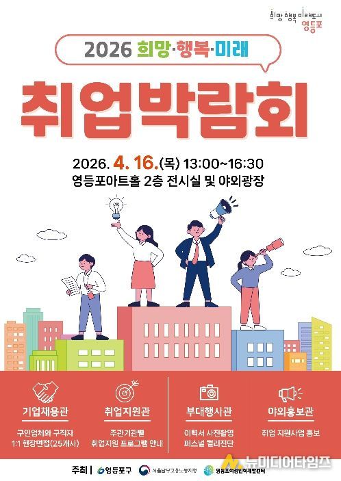 영등포구는 오는 4월 16일 영등포아트홀 2층 전시실 및 야외광장에서 320여 개 일자리를 제공하는 ‘2026 희망·행복·미래 취업박람회’를 개최한다고 밝혔다.