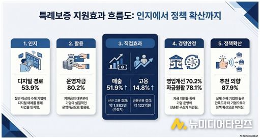 분석 결과, 특례보증 이용 이후 월 매출이 증가했다는 응답은 51.9%로 감소 응답 12.2%를 크게 웃돌았고, 영업상황 이 개선됐다는 응답은 70.2%, 자금운용이 원활해 졌다는 응답은 78.1%로 나타났다.