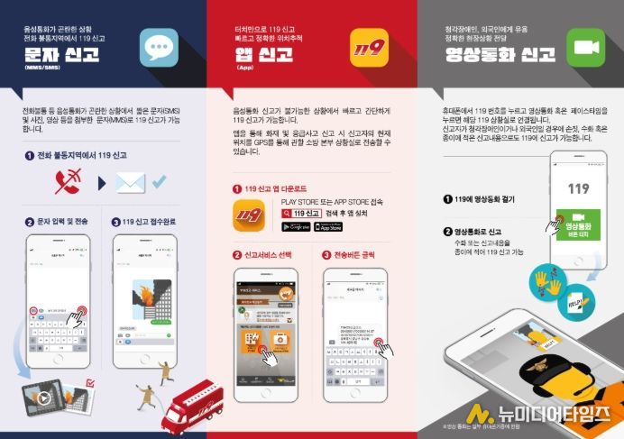 다매체 119 신고서비스는 기존 음성통화 방식 외에도 문자(SMS), 영상통화, 스마트폰 애플리케이션 등을 활용해 신고할 수 있는 제도다.