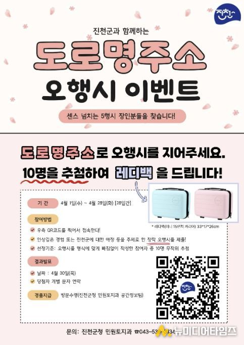 참여 방법은 진천군청 공식 사회관계망서비스와 누리집에 게시된 홍보 포스터의 정보무늬 코드를 통해 온라인 참여 페이지에 접속한 뒤, ‘도로명주소’를 주제로 한 오행시를 작성해 제출하면 된다.