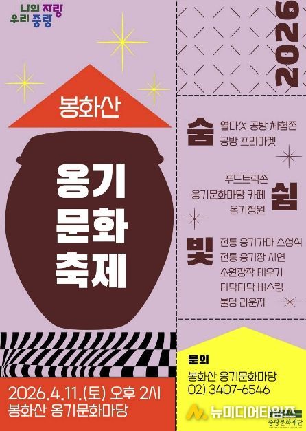 중랑구가 4월 11일 오후 2시, 신내동 봉화산 옹기문화마당에서 서울시 유일의 전통 가마를 활용한 ‘2026 봉화산 옹기문화축제’를 개최한다. 이번 축제는 작년에 개관한 ‘봉화산 옹기문화마당’의 운영과 전통 옹기가마 가동을 기념해 마련됐다.