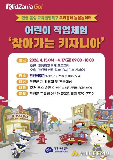 충북 진천군은 교육발전특구 사업의 하나로 어린이 직업체험 프로그램 ‘찾아가는 키자니아’를 오는 4월 15일부터 17일까지 3일간 진천화랑관에서 개최한다고 밝혔다.