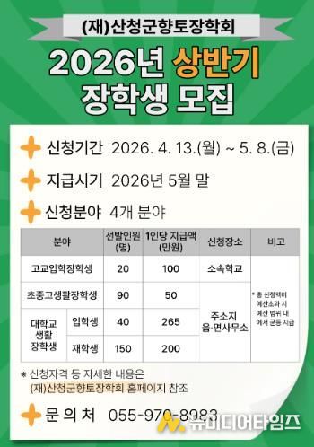 (재)산청군향토장학회는 오는 13일부터 5월 8일까지 ‘2026년도 상반기 장학금’을 신청받는다고 10일 밝혔다.