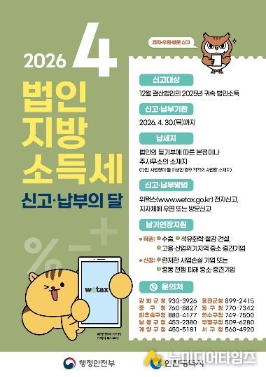 중구 관계자는 “법인지방소득세를 신고해야 하는 법인은 기한 내 관련 절차를 마쳐 가산세 부담 등 불이익을 받지 않도록 해야 한다”라며 “경영에 어려움을 겪고 있는 중소기업 등 납세자를 위한 적극적인 세정 지원에 최선을 다하겠다”라고 말했다.