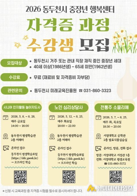 동두천시 미래교육진흥원은 지역 내 중장년층의 성공적인 인생 2막과 안정적인 사회 참여를 지원하기 위해 ‘2026년 중장년 행복센터 자격증 과정’ 수강생을 모집한다고 밝혔다.