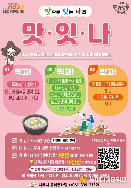 전남 나주시가 ‘2026 나주방문의 해’를 맞아 시 대표 음식 브랜드인 ‘나주밥상’을 앞세운 사계절 미식 이벤트 ‘맛으로 잇는 나주, ‘맛잇나’의 2회차(봄) 운영을 본격적으로 시작한다.