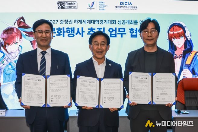 2027 충청 유니버시아드대회 조직위원회(위원장 강창희, 이하 조직위)는 10일 대전 e스포츠 경기장 ‘드림 아레나’에서 대전정보문화산업진흥원(이하 진흥원), ㈜님블뉴런과 e스포츠 연계 문화행사 추진을 위한 업무협약(MOU)을 체결했다고 밝혔다.