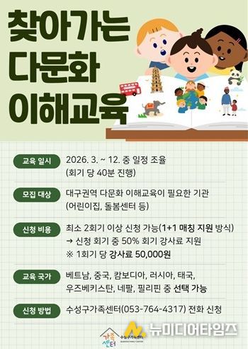 한편, 수성구가족센터는 ‘찾아가는 다문화 이해교육’을 통해 다문화 여성의 사회참여를 지원하고 있다. 이 사업은 어린이집, 돌봄센터 등 교육이 필요한 기관을 대상으로 다문화 여성 강사가 직접 방문해 자국의 문화와 언어를 소개하는 프로그램이다.