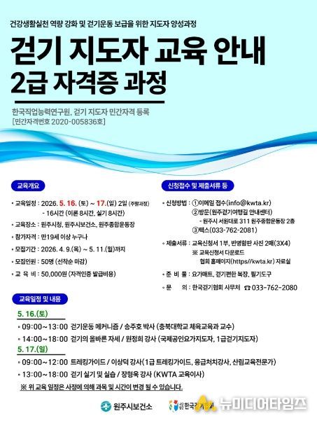 원주시보건소는 시민들의 올바른 걷기 문화 확산을 위해 5월 11일까지 상반기 ‘걷기지도자 2급 과정’ 수강생 50명을 선착순으로 모집한다.