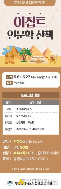 한동인 중앙도서관장은 “이번 프로그램을 통해 시민들이 이집트 문명을 매개로 인간과 세계를 바라보는 시야를 넓히고, 여행의 감성과 함께 인문학적 사유를 나누는 뜻깊은 시간이 되길 바란다”고 말했다.