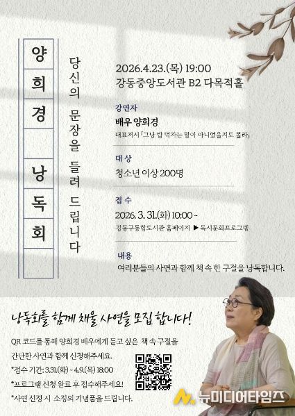 이번 프로그램은 도서관이 단순히 머무는 공간을 넘어 도서관 이용자가 직접 프로그램의 주체로 참여하고 창작과 소통을 경험하는 공간이 될 수 있도록 기획됐다. 대표 프로그램으로는 배우 양희경과 함께하는 낭독회 '당신의 문장을 들려드립니다'가 준비되어 있다. 세계 책의 날을 맞아 4월 23일 오후 7시에 시작될 이 프로그램은 사전 공모를 통해 접수된 구민들의 사연과 문장을 라디오 형식으로 낭독하고 이야기를 나누는 방식으로 진행된다. 배우 양희경의 마음을 어루만져 주는 목소리가 참여자들에게 깊은 공감과 따뜻한 위로를 전하며 문학을 보다 친근하게 만날 수 있는 특별한 시간을 선사할 예정이다.