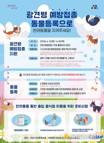 구는 접종 지원기간 동안 광견병 백신을 무료로 지원하며, 보호자는 시술료 1만 원만 부담하면 된다. 접종 가능한 동물병원 현황 등 자세한 사항은 구청 누리집(홈페이지)에서 확인할 수 있다.