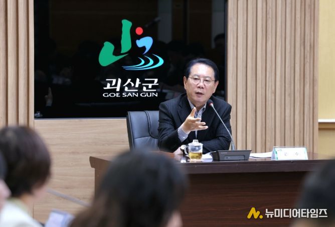 송인헌 괴산군수가 13일 군청 회의실에서 열린 확대간부회의에서 2026 괴산빨간맛페스티벌 준비와 농업예산 신속 집행을 주문했다.