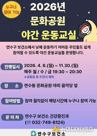 연수구 보건소는 이달부터 구민의 건강 증진과 일상 속 꾸준한 운동 습관 형성을 위해 문화공원에서 ‘야간 운동교실’을 운영한다.