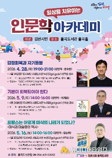 한편, 강연은 율곡도서관 율곡홀에서 진행되며 지역 주민 누구나 참여할 수 있다. 신청은 강연 회차별 일정에 맞춰 김천시립도서관 누리집을 통해 선착순으로 접수하면 된다.