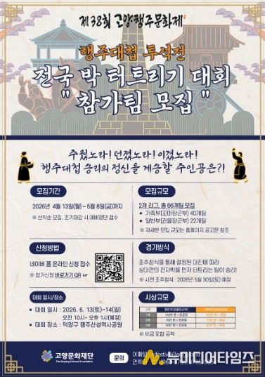 고양문화재단은 오는 6월 열릴 고양행주문화제의 대표 프로그램 중 하나인 행주대첩 투석전 ‘전국 박 터트리기 대회’의 참가팀을 오는 5월 8일까지 모집한다.