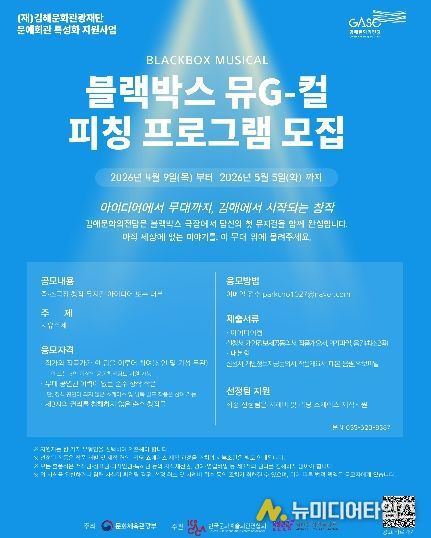 (재)김해문화관광재단(대표이사 최석철) 김해문화의전당은 2026 문예회관 특성화 지원사업의 일환으로 ‘블랙박스 뮤G컬’ 피칭 프로그램을 운영하고 창작뮤지컬 초연으로 이어지는 30분 리딩 쇼케이스의 작품 공모를 진행한다.