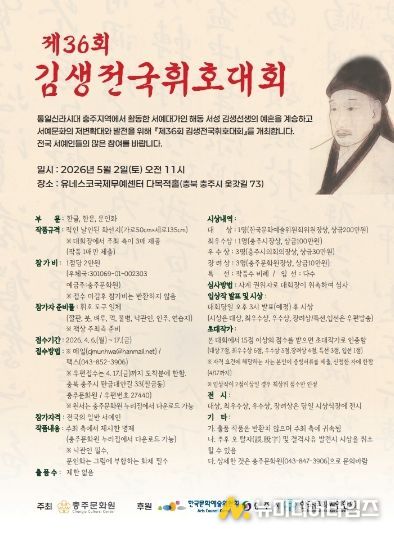 전국의 서예가를 대상으로 오는 5월 2일 유네스코국제무예센터 다목적홀에서 개최되는 이번 대회는 4월 17일까지 참가자를 접수한다. 대회 부문은 한글, 한문, 문인화 등 3개 부문으로 운영되며, 작품 명제는 충주문화원 누리집에서 확인할 수 있다.