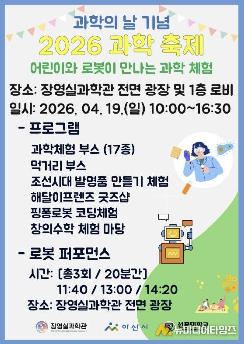 아산시는 과학의 날을 맞아 오는 19일, 장영실과학관에서 ‘2026 과학 축제’를 개최한다. 이번 축제는 장영실과학관이 주최하고 아산시와 선문대학교가 주관하여 시민들에게 다채로운 과학 문화 체험의 장을 선사할 계획이다.