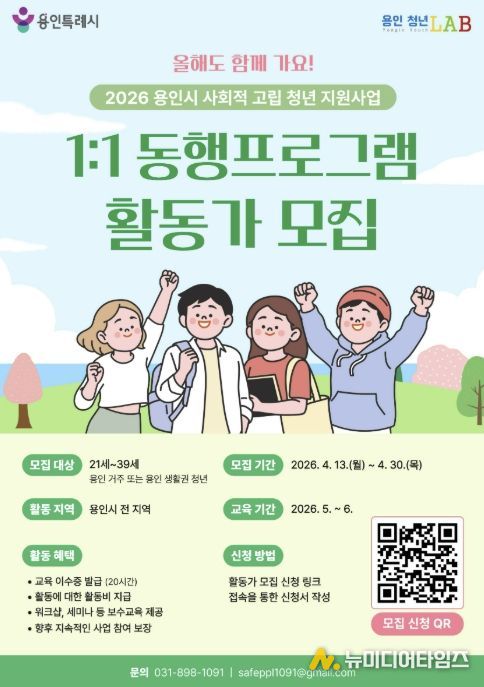 용인특례시는 사회적 고립 청년의 정서적 회복과 사회 복귀를 지원하기 위한 동행 활동가 20명을 모집한다고 14일 밝혔다.