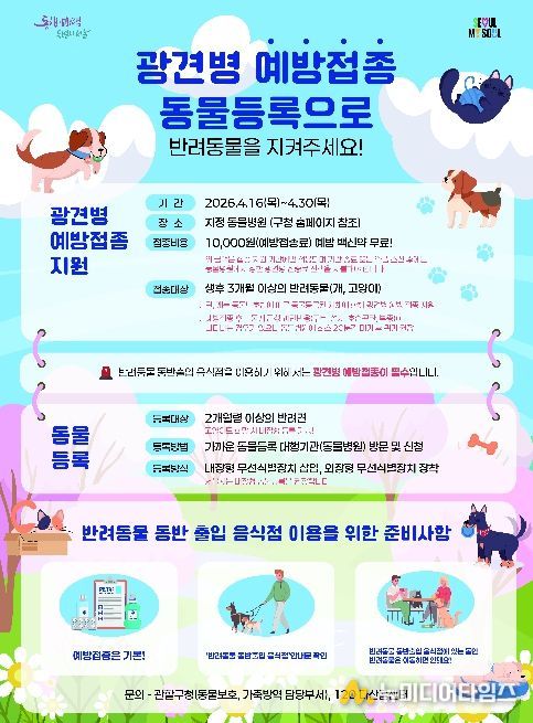 구 관계자는 “광견병 예방접종은 내 가족과 이웃의 안전을 위한 소중한 실천”이라며, “반려동물 양육가구의 의료비 부담을 줄이고 성숙한 반려 문화가 정착될 수 있도록 주민 여러분의 적극적인 참여를 부탁드린다”고 전했다.