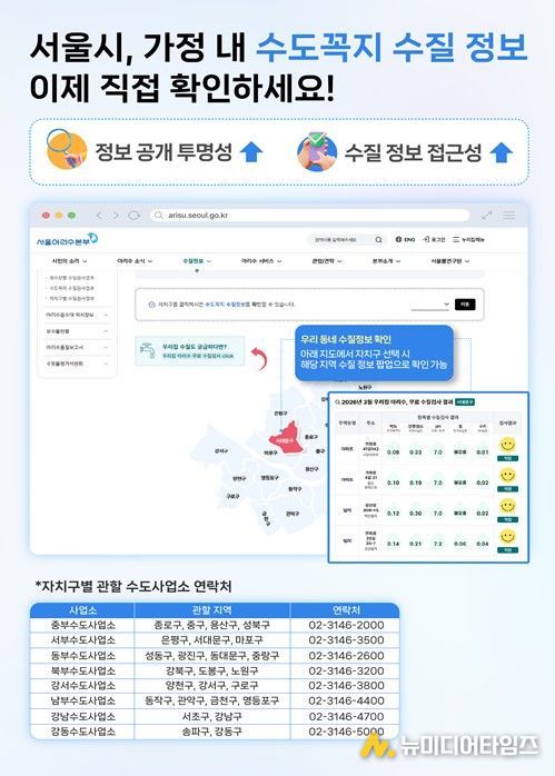 한편, 서울시는 시민이 보다 쉽고 편리하게 우리집 수돗물 수질을 확인할 수 있는 가정방문 무료 수질검사 서비스를 ‘우리집 아리수, 무료 수질검사’로 명칭을 선정·운영한다. 해당 서비스는 시민이 직접 수질검사를 받을 수 있는 체감형 서비스로, 수돗물에 대한 궁금증을 해소하고 안심하고 음용할 수 있도록 지원하는 데 목적이 있다.