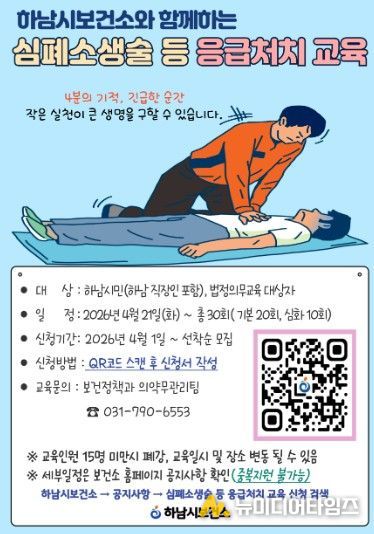 하남시보건소는 시민의 응급상황 대응 능력을 강화하고 안전한 지역사회 환경을 조성하기 위해 오는 4월 21일부터 11월 3일까지 ‘2026년 심폐소생술 등 응급처치 교육’을 실시한다고 10일 밝혔다.