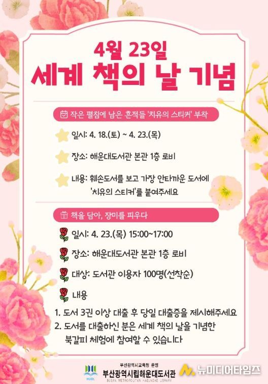 부산광역시립해운대도서관은 오는 18일부터 23일까지 도서관 본관 로비에서 도서관 이용자를 대상으로 ‘세계 책의 날(4월 23) 기념 프로그램’을 운영한다.