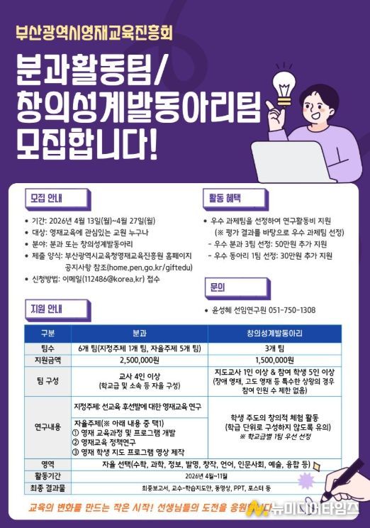 부산광역시교육청영재교육진흥원은 오는 27일까지 영재교육에 관심 있는 교원을 대상으로 ‘2026년도 영재교육진흥회 연구과제 팀’을 공개 모집한다.