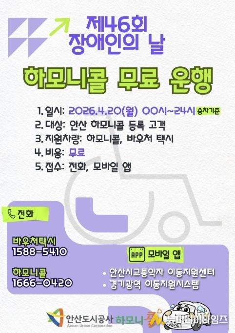 안산도시공사는 오는 4월 20일 ‘제46회 장애인의 날’을 맞아 교통약자를 위한 특별교통수단인 하모니콜과 바우처택시를 하루 동안 무료 운행한다고 16일 밝혔다.