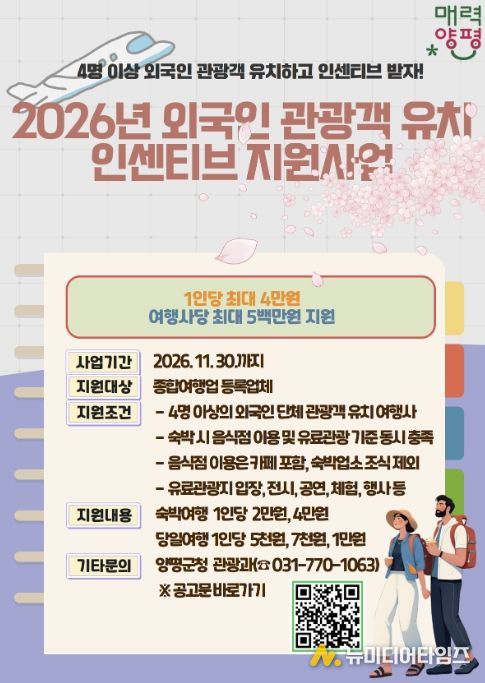 양평군은 외국인 관광객 유치를 촉진하고 침체된 지역 관광산업에 활력을 불어넣기 위해 ‘2026년 양평군 외국인 관광객 유치 인센티브 지원사업’을 추진한다고 밝혔다.