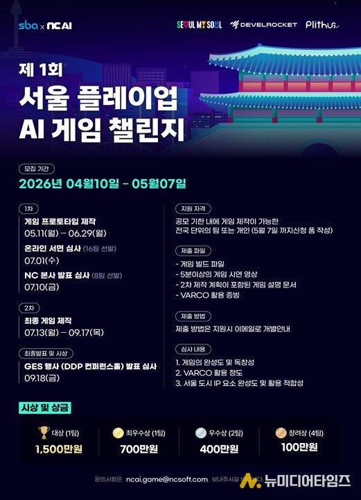 서울시는 ㈜엔씨의 AI 전문 자회사 NC AI와 협력해 ‘서울 플레이업 AI 게임 챌린지’를 개최하고, 서울 명소를 활용한 게임 콘텐츠 발굴과 개발 지원에 나선다고 밝혔다. 국내 대표 게임기업의 AI 기술을 공공 프로젝트에 접목한 사례라는 점에서도 의미가 있다.