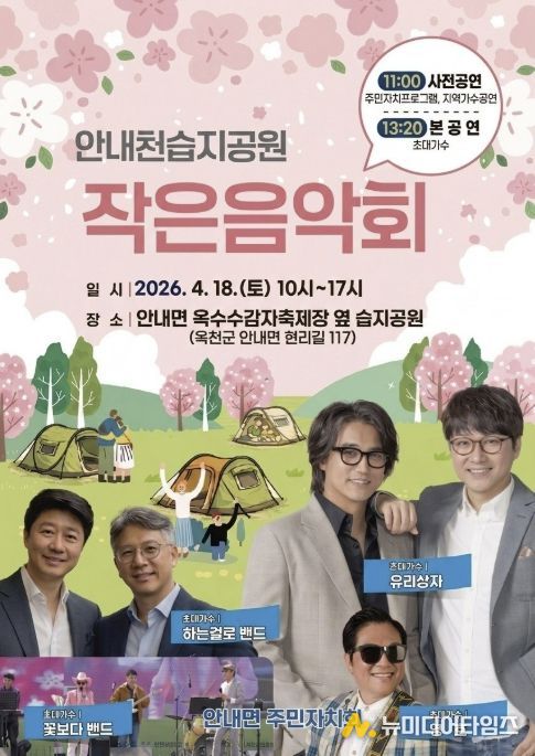 옥천군 안내면 주민자치회는 오는 4월 18일 토요일, 안내천 인공습지 일원에서 주민들과 함께하는 문화 행사 '안내천 습지공원 작은 음악회'를 개최한다.