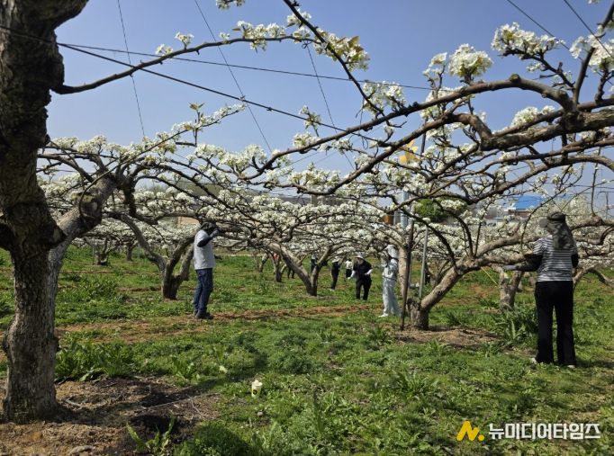이번 일손돕기는 배꽃 개화 시기가 예년보다 다소 앞당겨지고, 기온 변화에 따라 수정 가능 기간이 3~4일 내외로 짧아진 상황을 고려해, 적기 수분을 통해 결실률을 높이고 고품질 배 생산을 지원하기 위해 마련됐다.