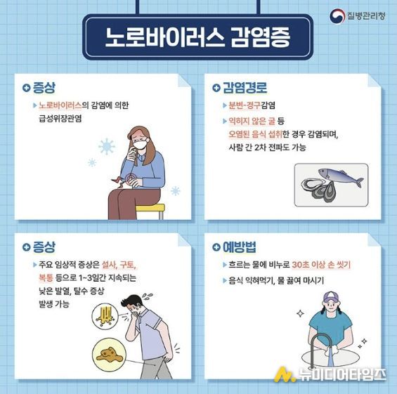 노로바이러스 감염증은 노로바이러스에 의한 급성 위장관염으로 수인성 매개 감염병이며. 10~100개의 소량으로도 감염력이 높아 집단 구토·설사를 일으킬 수 있다.